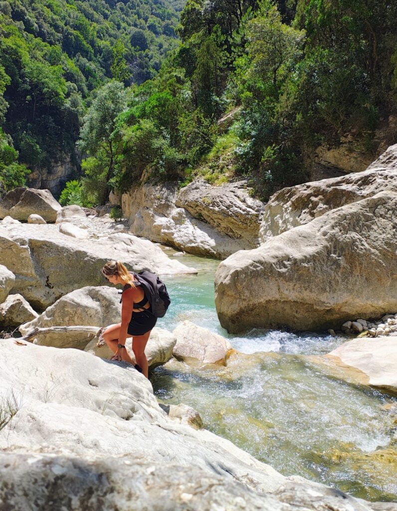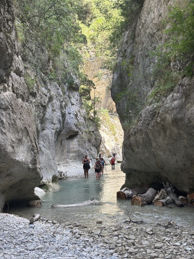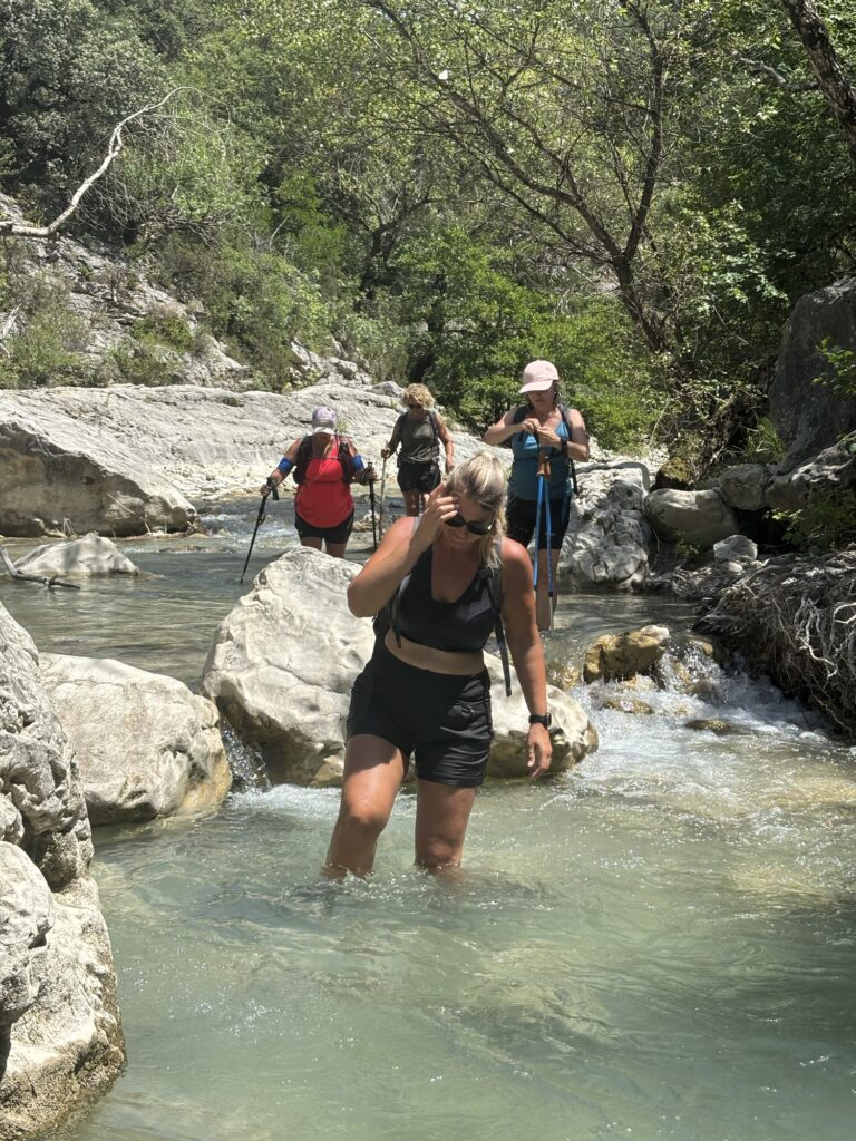 Vandaag gaan we ruig doen. We rijden naar Mollans (10 km), waar we starten met de wandeling door de Gorges van de Toulourenc, een echt spektakel en gerust een van de hoogtepunten van de wandelweek te noemen. We starten met een wandeling van 13 kilometer over land, langs ruige rotsen en diepe dalen. Onder ons stroomt de rivier de Toulourenc. Vervolgens dalen we af naar beneden naar de rivier. We lopen deze middag DOOR het water door de Gorges (gorge is keel op z’n Frans) de Toulourenc 12 km terug naar het beginpunt. Bij normale waterstand komt het water maximaal tot aan je borst. Het is een prachtige wandeling, verkoelend bij warm weer, en met prachtige rotsformaties links en rechts van je, uitgesleten door de rivier. Dit is geen gevaarlijke tocht maar wel een avontuurlijke. Als het weer het niet toe laat of als het water te hoog staat verschuiven of annuleren we deze wandeling, maar we hopen niet dat dit nodig is, want deze wandeling MOET je gedaan hebben. De tocht door de rivier is werkelijk spectaculair. Door de hoogteverschillen zijn er kleine watervalletjes, je moet klauteren en klimmen om over de soms grote rotsblokken verder te komen. Uitdagend maar geweldig om te doen. Deze dag is het ook zinvol om oude gymschoenen/wandelwaterschoenen aan te doen om door de rivier deze grote afstand te lopen. Op slippertjes kun je het vergeten.